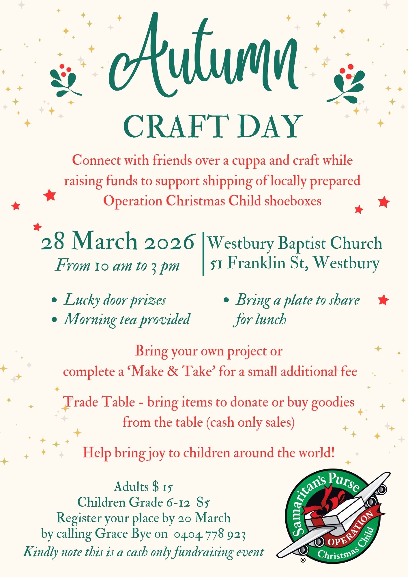 A fun day of craft and community to raise money for Samaritan’s Purse Operation Christmas Child. Funds raised will support the shipping costs of locally prepared Christmas shoeboxes. Register your place by calling Grace Bye on 0404 778 923.