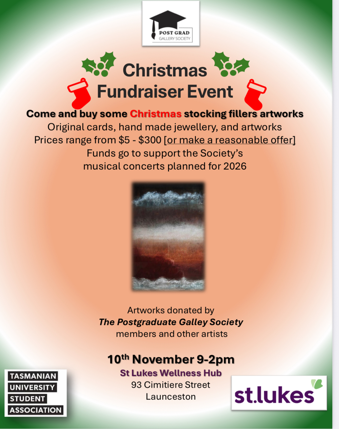 Original cards, hand made jewellery, and artworks. Prices range from $5 – $300 [or make a reasonable offer]  Funds go to support the Society’s musical concerts planned for 2026.