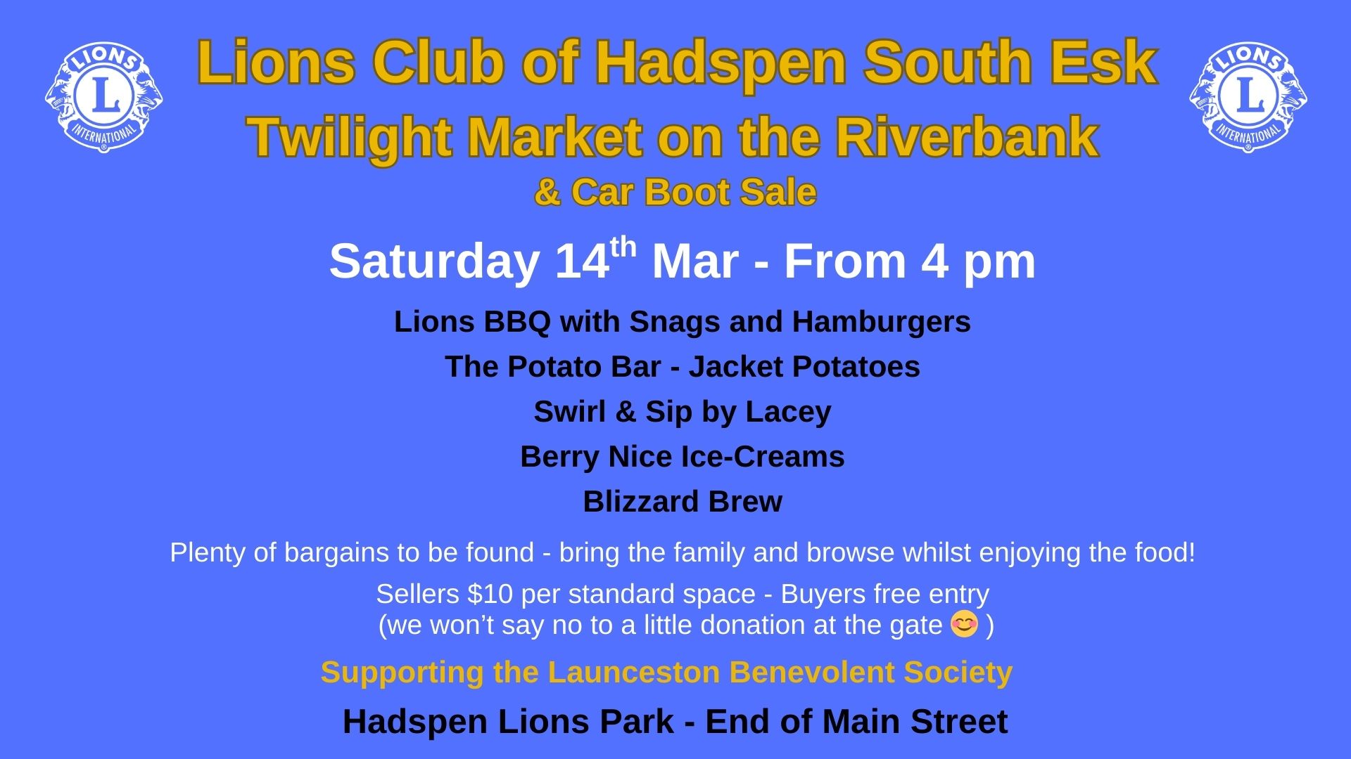 The Hadspen Lions are hosting their last Market on the Riverbank for this season. Sellers can enter from 3 pm with the Market starting at 4pm. Still only $10 per standard space and buyers enter for free. No need to book but Market sellers can send us their details and some pictures for promotional posts. Food, lots of food – Make an evening of it, come down for a bite to eat and browse the stalls. Lions BBQ, The Potato Bar, Berry Nice Ice-Creams, Swirl & Sip by Lacey and Blizzard Brew. Fantastic community event, don’t miss out!