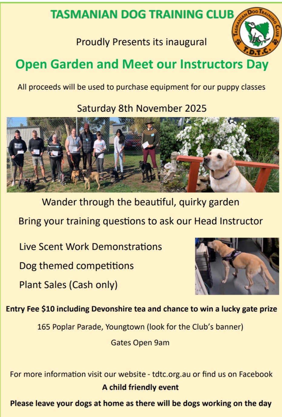 Come and Join us at our Inagural Open Garden and meet the Instructors Day. Wander through a delightful garden, watch the Scentwork demos and enjoy a delishious devonshire tea. Competitions to enter, plant sales, lucky gate prize and giveaways across the day.